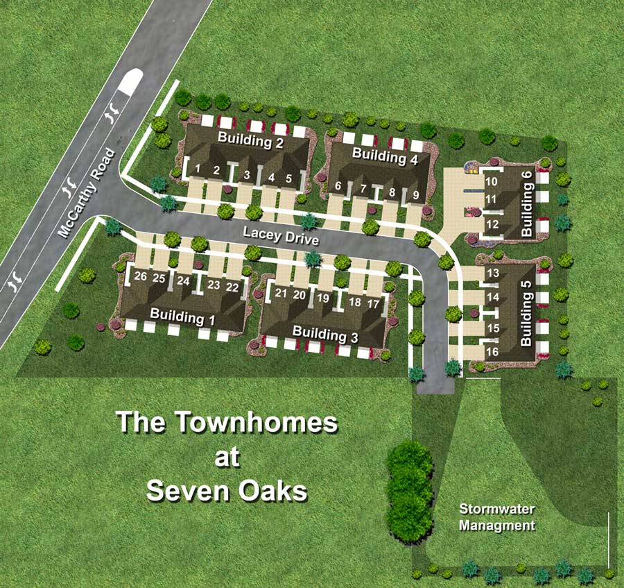 Seven Oaks is a new 26-unit townhome development in Lemont, Illinois. Its six building site plan is located on nearly five and a half acres west of the Derby Plaza shopping center. Each building comprises between three and five units.